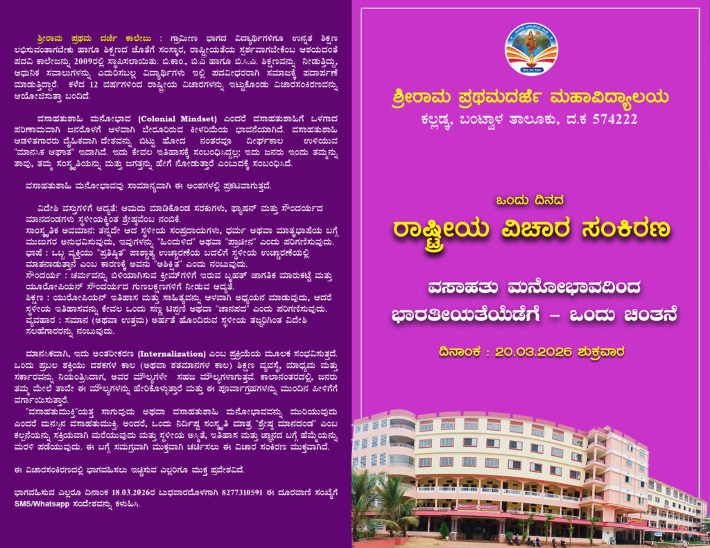 ಶ್ರೀರಾಮ ವಿದ್ಯಾಕೇಂದ್ರವು ಪ್ರತಿವರ್ಷವೂ ಹಮ್ಮಿಕೊಳ್ಳುವ, ಶ್ರೀರಾಮ ಪದವಿ ಕಾಲೇಜಿನ ಆಶ್ರಯದಲ್ಲಿ ನಡೆಯುವ ರಾಷ್ಟ್ರೀಯ ವಿಚಾರ ಸಂಕಿರಣವು (13ನೇ) “ಪ್ರಚಲಿತ ಭಾರತ- ಸತ್ಯ ಮಿಥ್ಯೆ” ಎಂಬ ವಿಷಯದ ಕುರಿತು ತಾ. 25/02/2025ರಂದು ಪದವಿ ವಿಭಾಗದ ಆಜಾದ್ ಭವನದಲ್ಲಿ ನಡೆಯಿತು. ಪ್ರತಿವರ್ಷವೂ ದೇಶದ ಹಿತಚಿಂತನೆಯ ವಿಷಯದ ಕುರಿತು ವೈಚಾರಿಕ ಗೋಷ್ಠಿಗಳು ನಡೆಯುತ್ತಿದ್ದು ಈ ವರ್ಷ ಪ್ರಸಕ್ತ ಭಾರತದ ವಿದ್ಯಮಾನಗಳ ಮಿಥ್ಯೆಗಳನ್ನು ಬೆಳಕಿಗೆ ತರುವ ಮೂಲಕ ಆಗುಹೋಗುಗಳ ನಿಜಾಂಶಗಳ ಕುರಿತು ಚಿಂತನೆ ನಡೆಸಲಾಯಿತು. ಉಡುಪಿ- ಮಂಗಳೂರುಗಳಲ್ಲಿ ಐಪಿಎಸ್ ಅಧಿಕಾರಿಯಾಗಿ ತಮ್ಮ ದಕ್ಷತೆ-