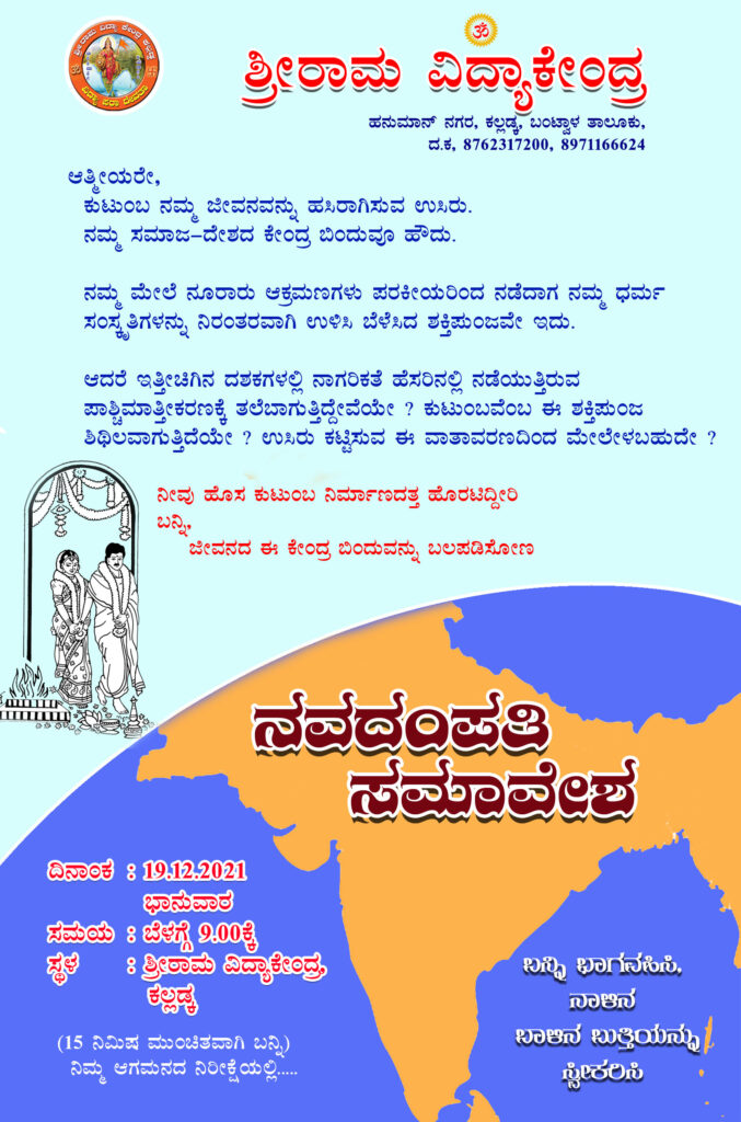 ಕಲ್ಲಡ್ಕ ಶ್ರೀರಾಮ ವಿದ್ಯಾಕೇಂದ್ರದಲ್ಲಿ ೨೦ನೇ ವರ್ಷದ ನವದಂಪತಿ ಸಮಾವೇಶ ೧೯.೧೨.೨೦೨೧ ನೂತನವಾಗಿ ಗೃಹಸ್ಥಾಶ್ರಮವನ್ನು ಪ್ರವೇಶಿಸಿದ ದಂಪತಿಗಳಿಗೆ ಆಯೋಜಿಸಿದ ಕಾರ್ಯಕ್ರಮ ನವದಂಪತಿ ಸಮಾವೇಶ ಶ್ರೀರಾಮ ವಿದ್ಯಾಕೇಂದ್ರ ಕಲ್ಲಡ್ಕದ ವೇದವ್ಯಾಸ ಧ್ಯಾನ ಮಂದಿರದಲ್ಲಿ ನಡೆಯಿತು. ಹಿರಿಯ ದಂಪತಿಗಳಾಗಿ ಭಾಗವಹಿಸಿದ ಕೃಷ್ಣಪ್ಪ ಹಾಗೂ ರಾಮಕ್ಕ ಅವರು ನವದಂಪತಿ ಸಮಾವೇಶವನ್ನು ಉದ್ಘಾಟಿಸಿ, ತಾವು ವೈವಾಹಿಕ ಜೀವನದಲ್ಲಿ ನಡೆದು ಬಂದ ಜೀವನದ ಅನುಭವವನ್ನು ನವದಂಪತಿಗಳಲ್ಲಿ ಹಂಚಿಕೊಂಡರು. ರಾಷ್ಟ್ರೀಯ ಸ್ವಯಂಸೇವಕ ಸಂಘದ ಪ್ರಮುಖರು, ಪುತ್ತೂರು ವಿವೇಕಾನಂದ ವಿದ್ಯಾವರ್ಧಕ ಸಂಘದ ಅಧ್ಯಕ್ಷ ಡಾ||ಪ್ರಭಾಕರ ಭಟ್ ಕಲ್ಲಡ್ಕ ಪ್ರಾಸ್ತಾವಿಕ